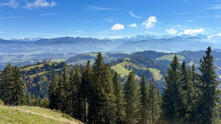 Schöne Herbstwanderung von Romoos auf den Napf und weiter nach Fankhus. Das Mittelland liegt unter einer Nebeldecke, die sich kaum auflöst. So führt der Blick mehr auf die Alpenkette.