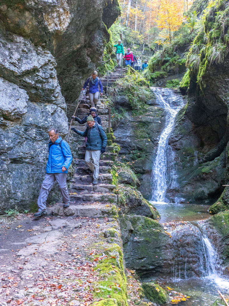 Wir starten bei nebligem, biesigem und kaltem Wetter in Mauborget. Aber schon bald tauchen wir ein in die mystische Schlucht Poeta Raisse und wandern zwischen Felswänden vorbei an Wasserfällen talwärts. Den Absinth am unteren Ende der Schlucht lassen wir bleiben, besuchen aber noch den Cascade de Môtiers, bevor wir in Môtiers an der Sonne die Wanderung mit einem Glas Wein begiessen.